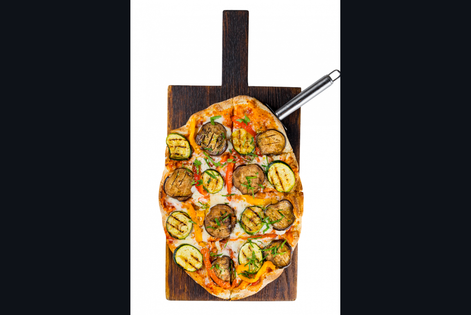 Соус помодоро, моцарелла, кабачки с баклажанами гриль, печеный перец, чеснок, орегано
