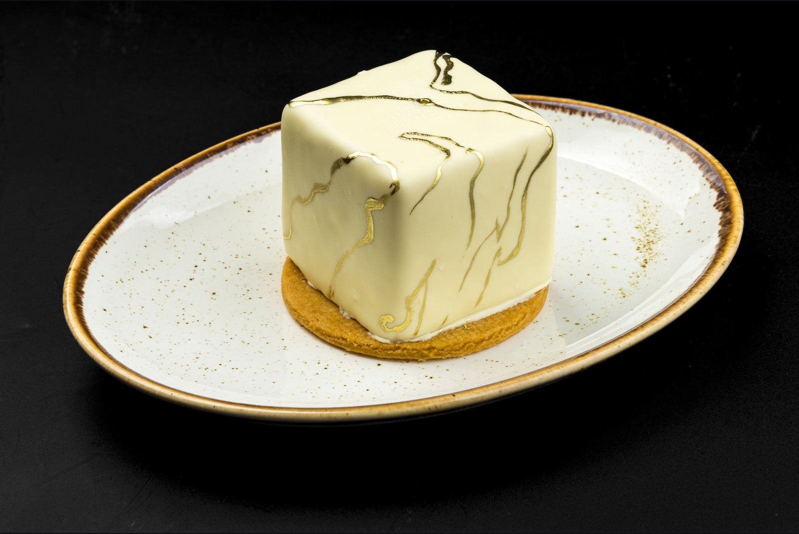 Тончайшее слоеное тесто собственного приготовления с заварным кремом из сыра бри, со свежими ягодами в ванильно-апельсиновом муссе и тонком белом шоколаде