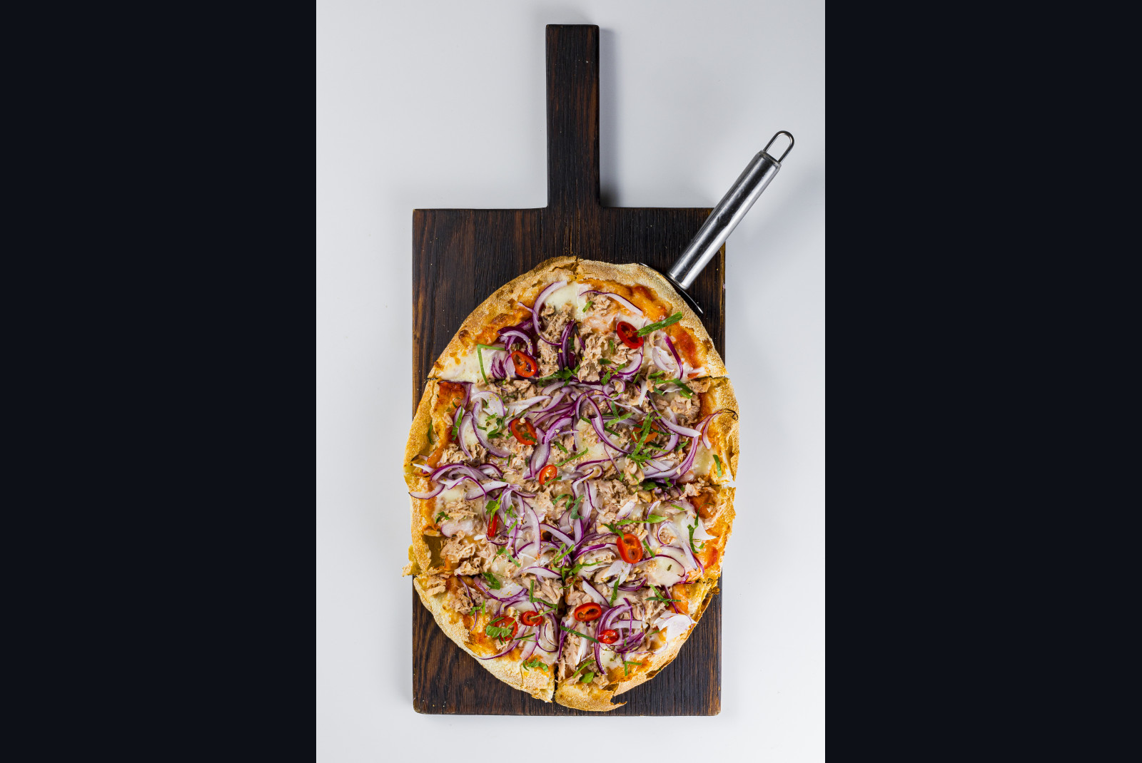 Соус помодоро, моцарелла, тунец консервированный, лук красный, острый перец