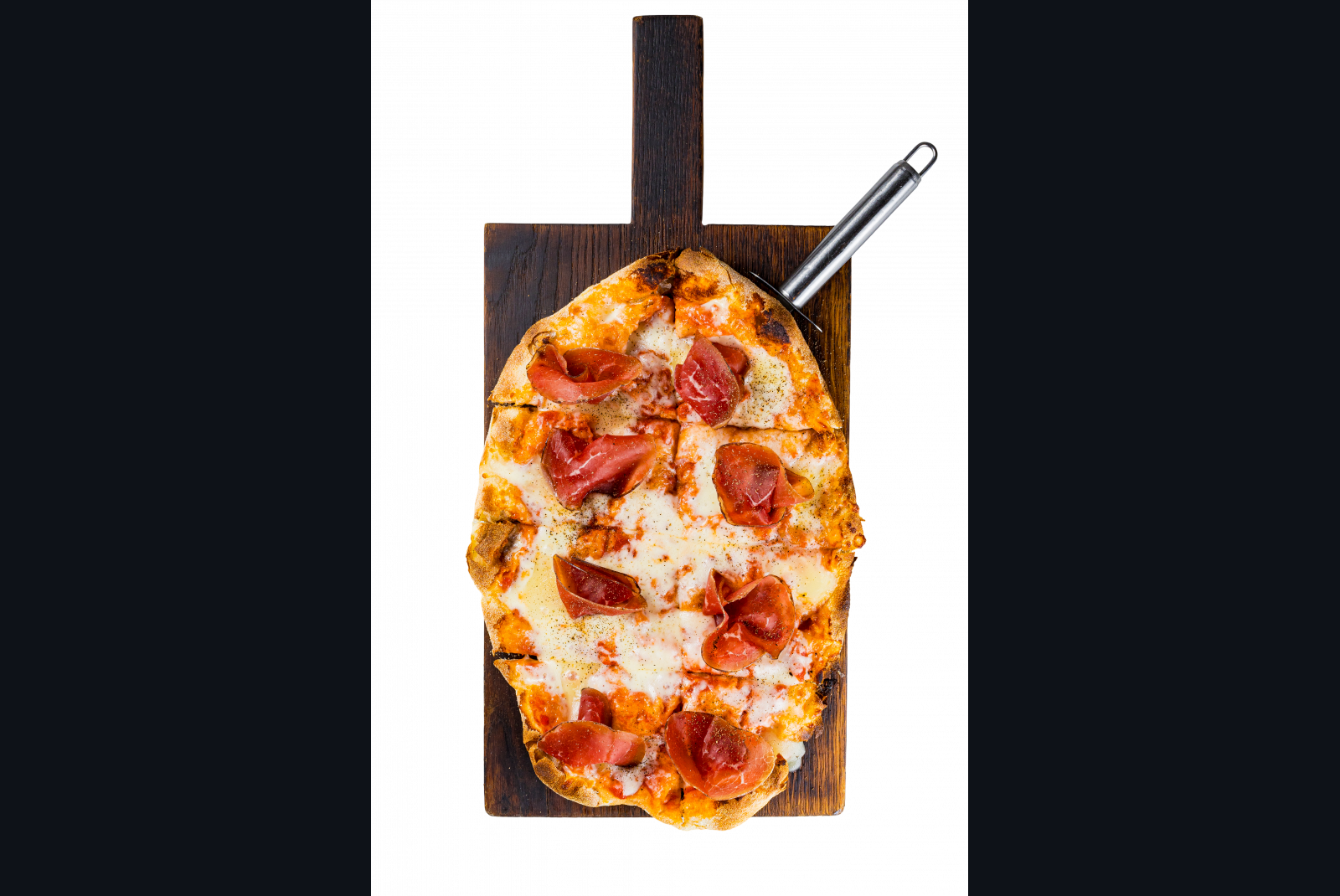 Соус помодоро, моцарелла, брезаола, таледжио, оливковое масло, тертый перец